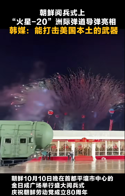 10月11日报道称,根据朝鲜报道,朝鲜官方在纪念朝鲜劳动党成立80周年阅兵式上展示了新型洲际弹道导弹“火星-20”,称其为该国“最具威力”的核武器。